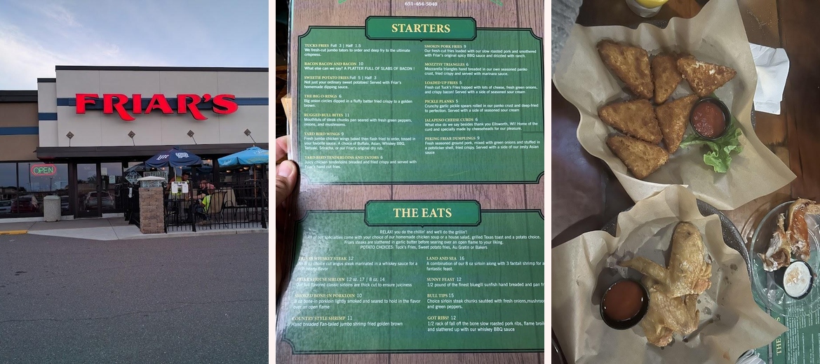 Friar's menu offers an appealing mix of classic pub fare and creative options that cater to diverse tastes. With an average meal price around $10.29, the menu remains budget-friendly while providing quality. Must-try items include their famed large-style wings, available at a great price during happy hour on Wednesdays.
